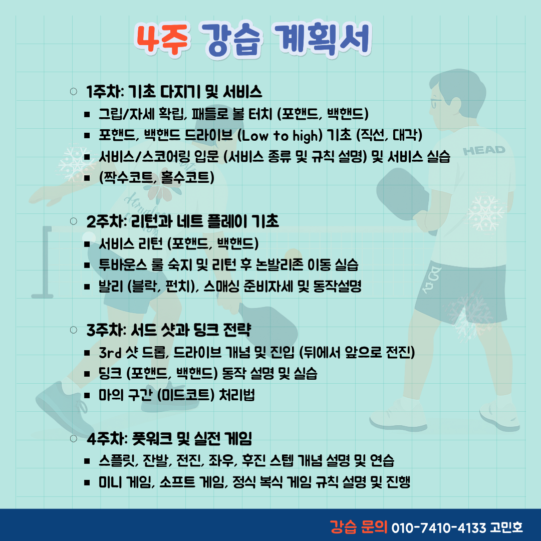 이번 강습은 광주 피클볼의 자존심, 고민호(픽턴) 강사님이 직접 지도합니다. 배드민턴 A조 출신의 탄탄한 기본기와 전국대회 입상 경력으로 "왜 안 되는지"를 정확하게 짚어드립니다.